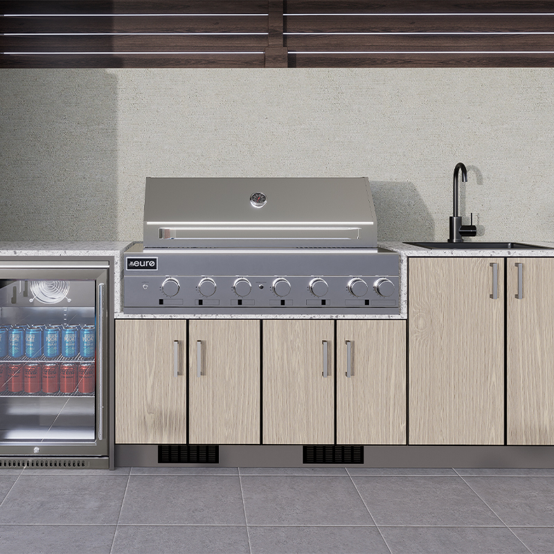 Our Grill Master ALFRESCO+ module comes in your choice of finishes and includes a single door beverage unit, a 6 burner gas BBQ and a PVD coloured stainless steel sink and tap. Please add a comment to your order with the preferred colour of your sink and tap.
