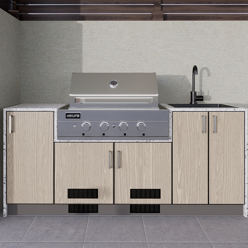Our Cook & Rinse ALFRESCO+ module comes in your choice of finishes and includes a 400mm 1 door cabinet, a 4 burner gas BBQ and a PVD coloured stainless steel sink and tap with a 600mm sink cabinet. Please add a comment to your order with the preferred colour of your sink and tap.