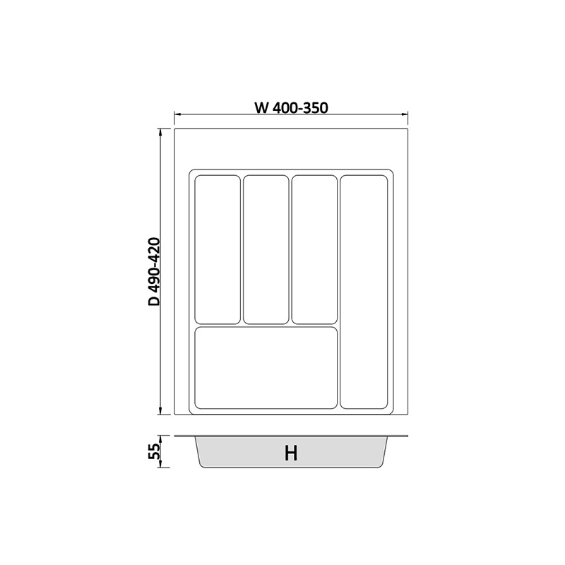 | Injection moulded cutlery trays Available in white or anthracite finishes Non-slip sound-deadened cutlery compartments Conveniently placed width indicators and cut lines for flexible modules 55mm height |
