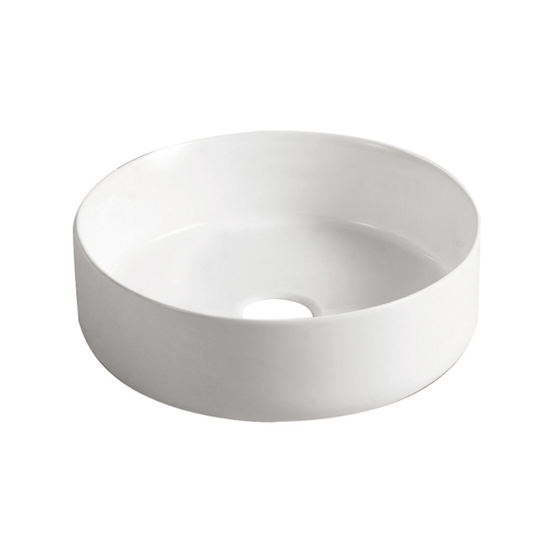 Slim round countertop basin in white polished ceramic. 355mm width x 355mm depth x 120mm height. No tap hole included. Plug and waste sold separately. 5 year warranty.
