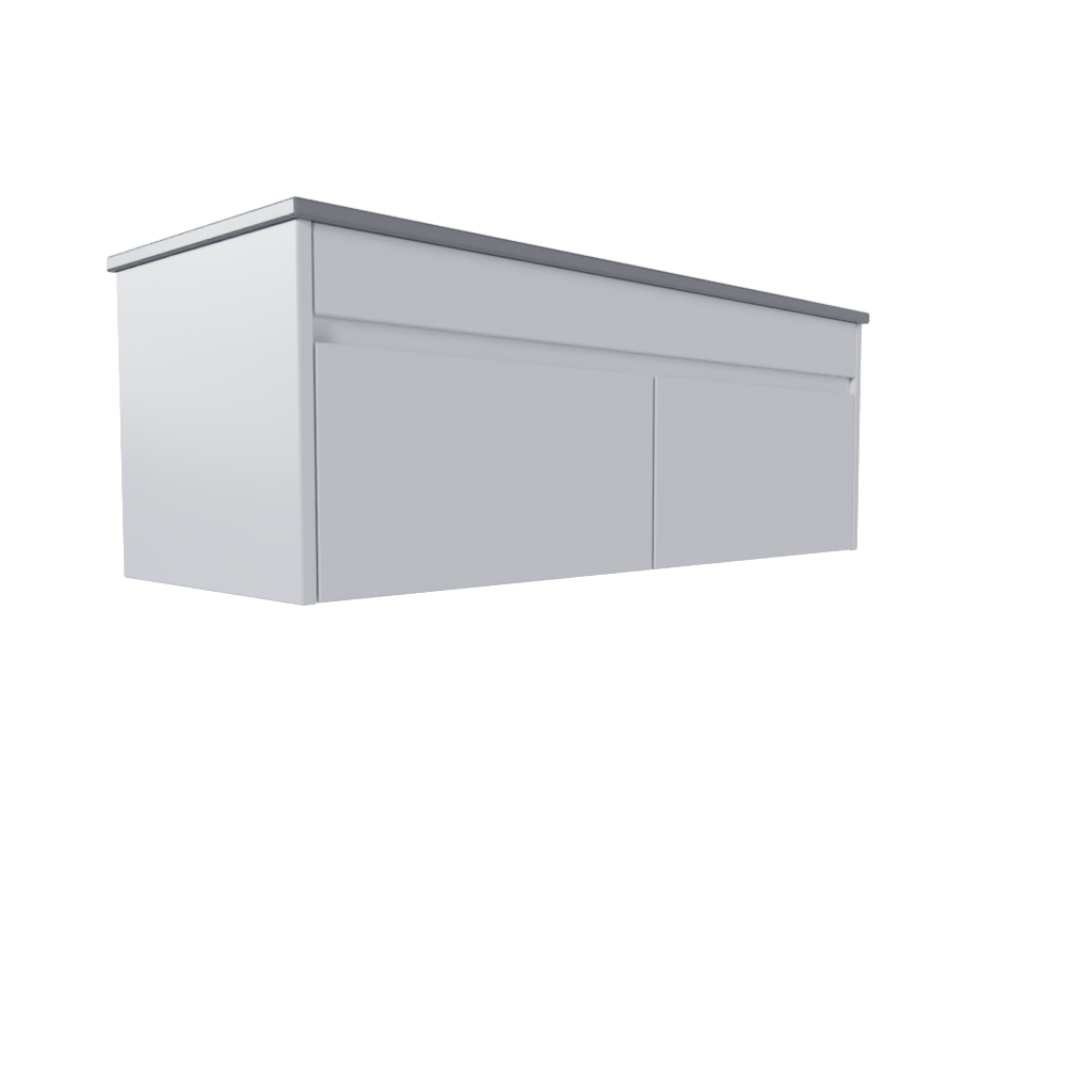 Assembled 2 drawer floating wall-hung base vanity unit with solid back panel and angled sharknose profile. 400mm high with 1200mm width and 459mm depth. Includes soft close drawers and plumbing channel.