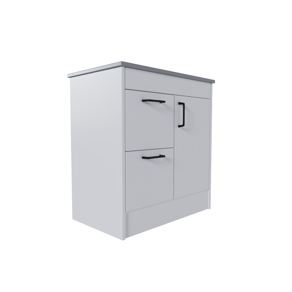 Assembled 1 door and 2 drawer freestanding vanity unit with solid back panel and left-hand side drawers. 810mm high with 459mm depth. Includes kickboard plinth cover and soft close drawers and hinges.