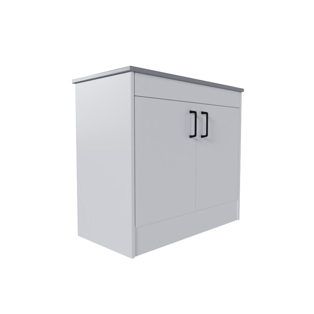 Assembled 2 door freestanding vanity unit with solid back panel. 810mm high with 459mm depth. Includes kickboard plinth cover and soft close hinges.