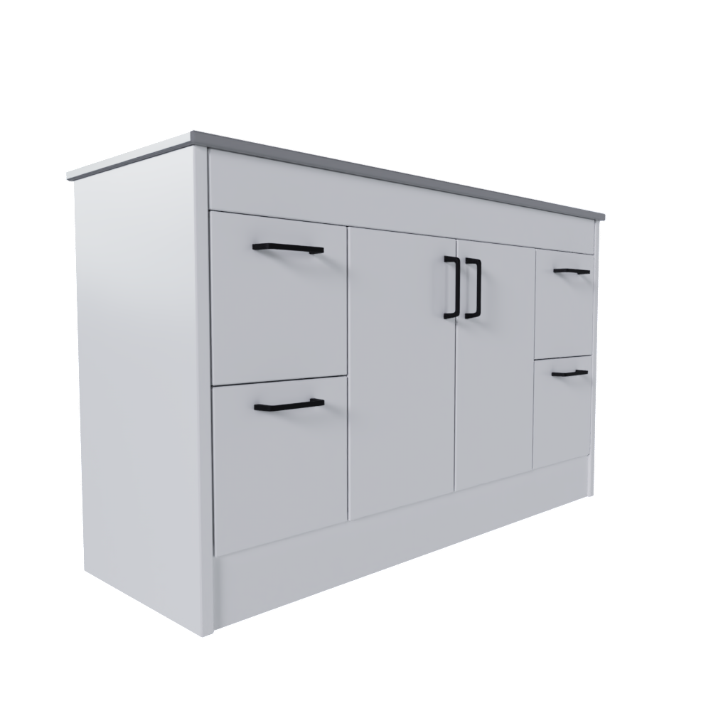 Assembled 2 door and 4 drawer freestanding vanity unit with solid back panel. 810mm high with 1500mm width and 459mm depth in OptiGrain Riven Walnut. Includes kickboard plinth cover and soft close drawers and hinges.