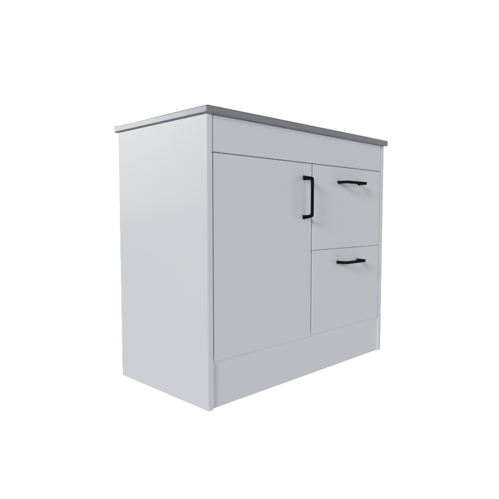 Assembled 1 door and 2 drawer freestanding vanity unit with solid back panel and right-hand side drawers. 810mm high with 900mm width and 459mm depth in OptiMatt Ivory. Includes kickboard plinth cover and soft close drawers and hinges.