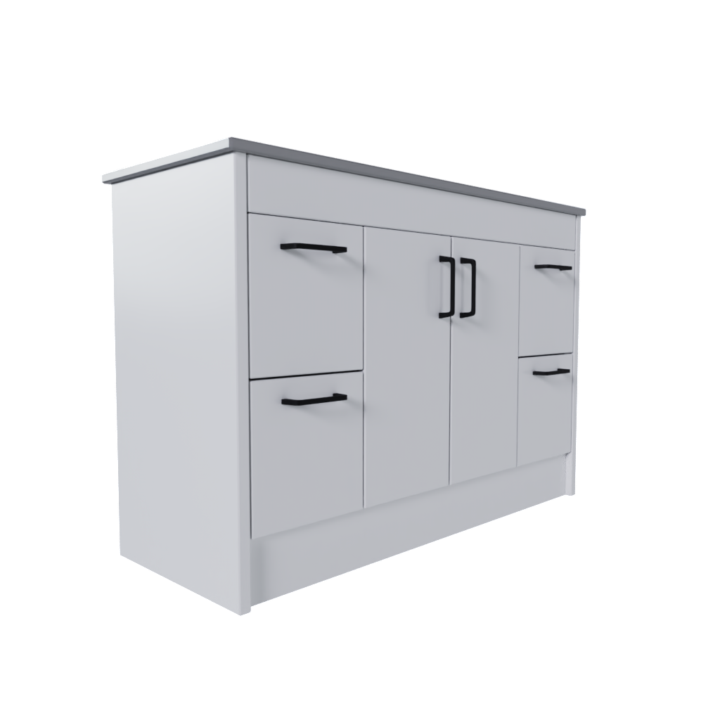 Assembled 2 door and 4 drawer freestanding vanity unit with solid back panel. 810mm high with 1200mm width and 459mm depth in OptiMatt Midnight. Includes kickboard plinth cover and soft close drawers and hinges.