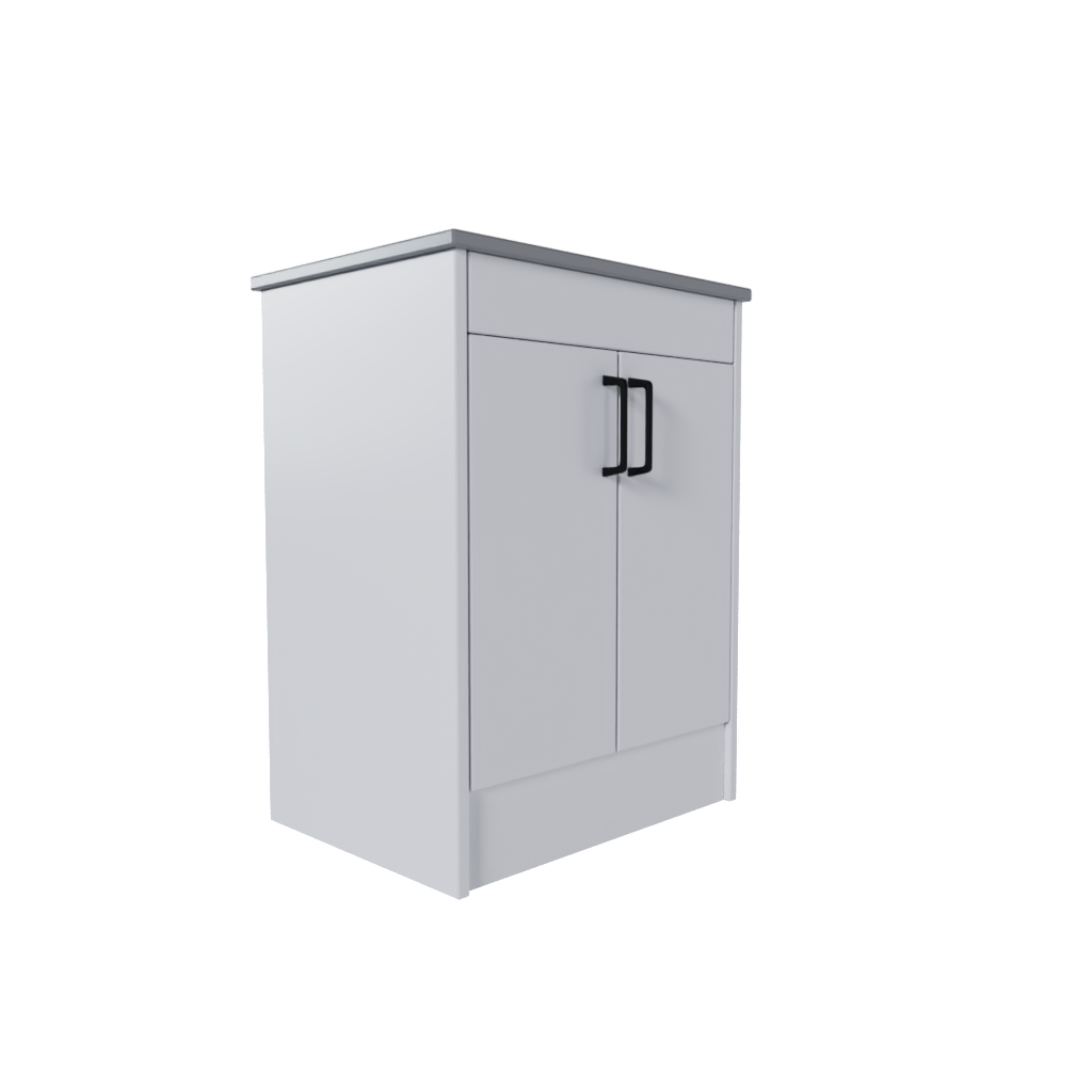 Assembled 2 door freestanding vanity unit with solid back panel. 810mm high with 600mm width and 459mm depth in OptiMatt Premium Black. Includes kickboard plinth cover and soft close hinges.