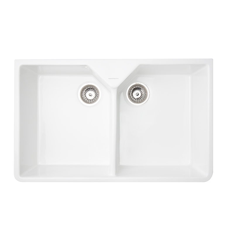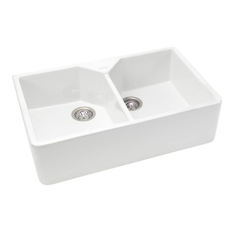 | This classic style white sink is hand crafted to the highest quality standards and is a perfect harmony of form and function Add a splash of colour with our coloured stainless steel taps and wastes Hand crafted natural ceramic 2x 28L Bowls High glaze white finish 90mm round basket waste included Note: Not to be installed with waste disposal units |