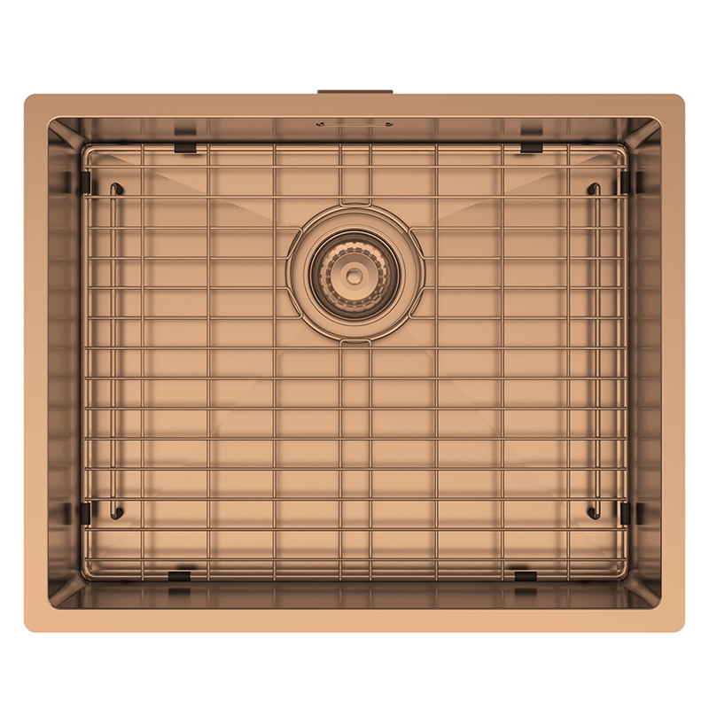 | A stainless steel sink, the PVD range is coloured using one of the most environmentally friendly colouring processes for a very hard and durable coating. Available in Matt Black, Gun Metal, Copper and Brass with matching base grid 1.2mm 304 Grade Stainless Steel Hand fabricated with main bowl overflow Satin finish 10mm corner radius 90mm round basket waste included 20mm flat flange |